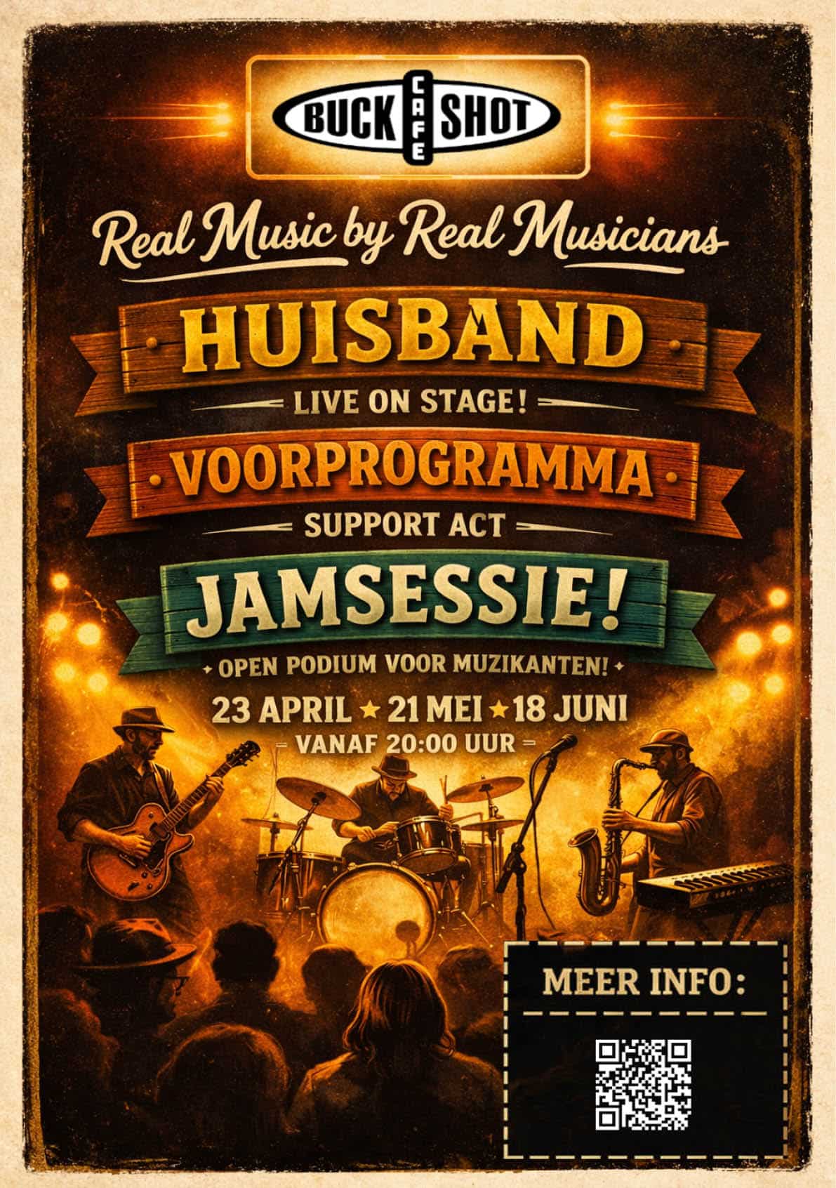 Na het bandgedeelte gooien we de deuren van het podium open voor een jamsessie, waar muzikale ontmoetingen en verrassende samenwerking centraal staan. Wil je onderdeel zijn van deze Buckshot Sessions?